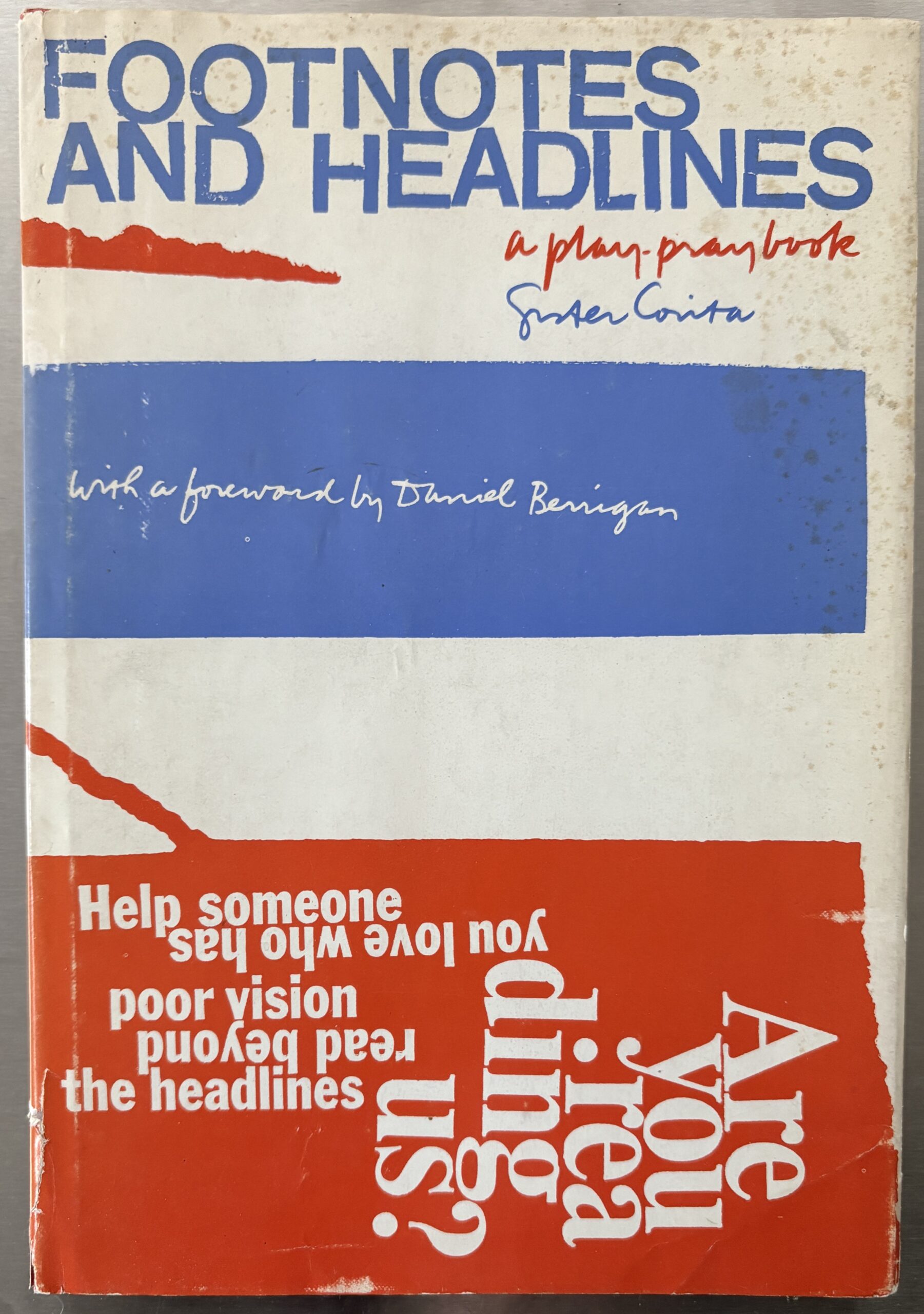 | Footnotes & Headlines (hardcover); "A Play Prayerbook" by Corita, Text: Sister Corita, Intro: Daniel Berrigan. 7 x 10 ¼" (cm 18×26); pp. 50; hardcover with dust jacket. Publisher: Herder and Herder, New York, 1967. More photos | ![]() |