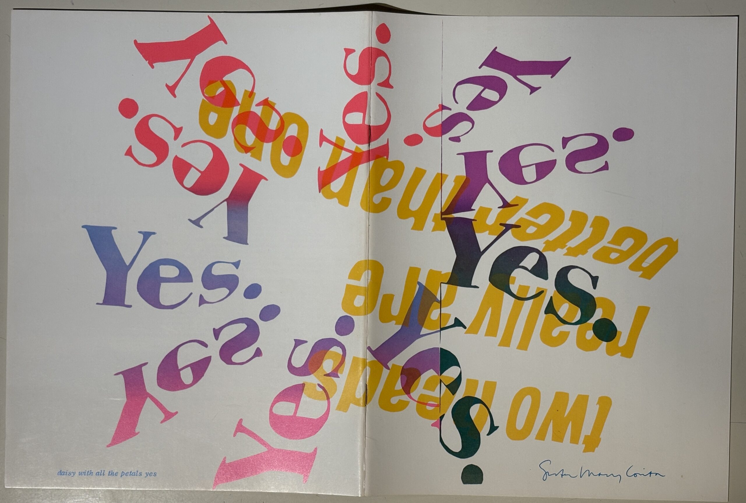| Corita Kent & Margaret Rigg (1966 First Edition) Yes (Daisy With All the Petals Yes), 32-page monograph; 8 ½" x 11 ¼" (cm. 22 x 28.5) Publisher: Immaculate Heart College Publication date: January 1, 1966 | ![]() |