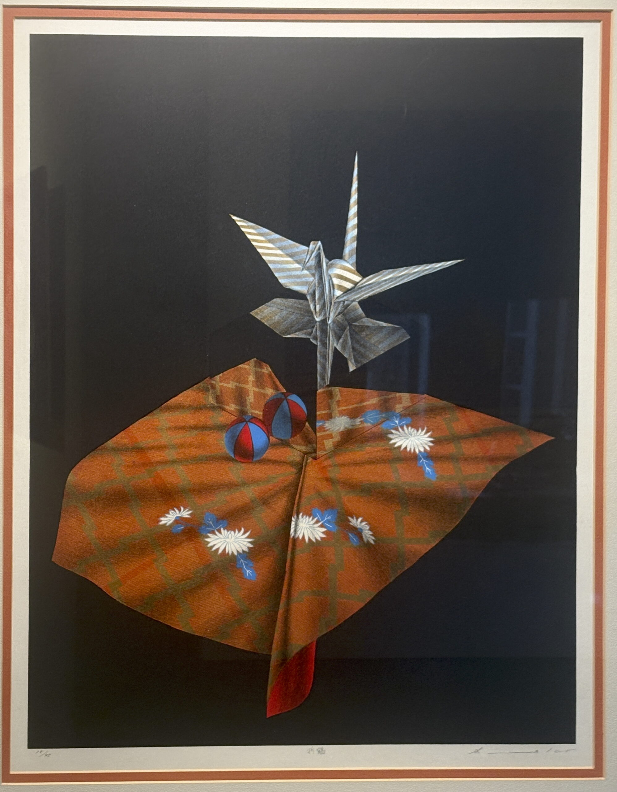 Haku Maki, print “Collection-62" 24” x 8 ¼", numbered (84/100) and signed by the artist, Features a ceramic vase with golden leaves in the design.